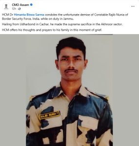 জানিব পৰা মতে ৱাটছ টাৱাৰ ভাঙি পৰাত মৃত্যু হয় জোৱানজনৰ।মৃত জোৱানজন কাছাৰৰ দয়াপুৰৰ ৰাজীৱ নুনীয়া ।ইয়াৰ উপৰিও মাত্ৰ দুমাহ পূৰ্বে BSFত যোগদান কৰিছিল ৰাজীৱ নুনীয়াই।BSFত যোগদান কৰিয়েই জম্মুত নিয়োজিত হৈছিল ৰাজীৱ।ইতিমধ্যে ৰাজীৱ নুনীয়াৰ মৃত্যুত শোক প্ৰকাশ কৰিছে মুখ্যমন্ত্ৰী হিমন্ত বিশ্ব শৰ্মাই।